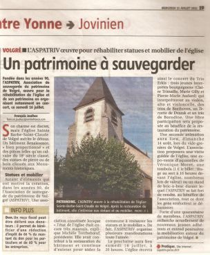 Autant d'éléments qui ont motivé la création, dans les années 90, de l'Association de sauvegarde du patrimoine de Volgré (ASPATRIV). Une association constituée lorsque « l'état de l'église était encore très mauvais, explique Michèle Torcheboeuf, présidente. Elle avait contribué à la restauration du bâtiment et continue d'exister pour aider la commune à restaurer les statues et le mobilier ». De fait, l'ASPATRIV organise plusieurs manifestations toute l'année.