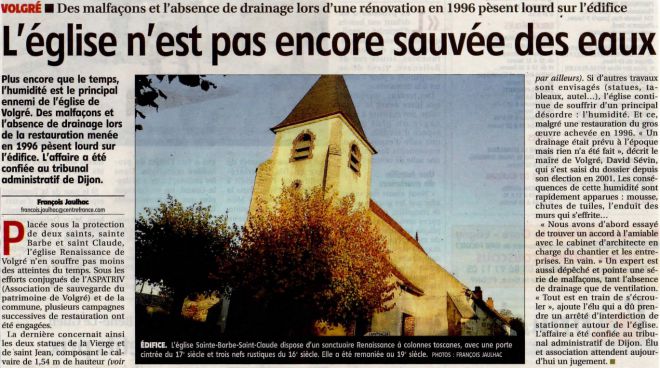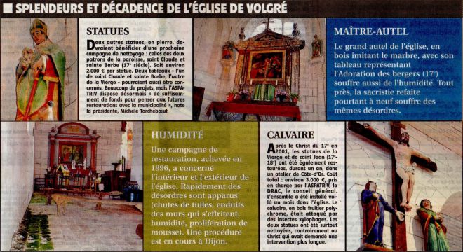 Les travaux de restauration concernant le maître-autel, le retable, le tabernacle, le tableau de la Nativité, objets classés M.H., vont commencer. L'ASPATRIV et la commune, avec la Fondation du Patrimoine, lancent une novelle souscription (...)